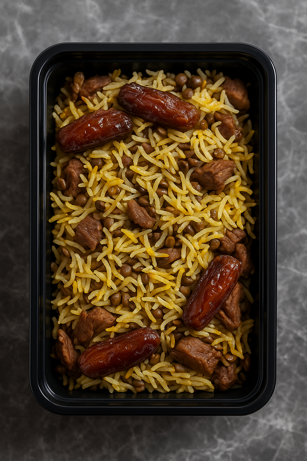 A fragrant and hearty Persian rice dish made with tender lamb shoulder, slow-cooked with lentils, caramelised onions, and warm spices like cinnamon and turmeric. The layers of fluffy basmati rice and savoury lentils are gently steamed together, garnished with dates.