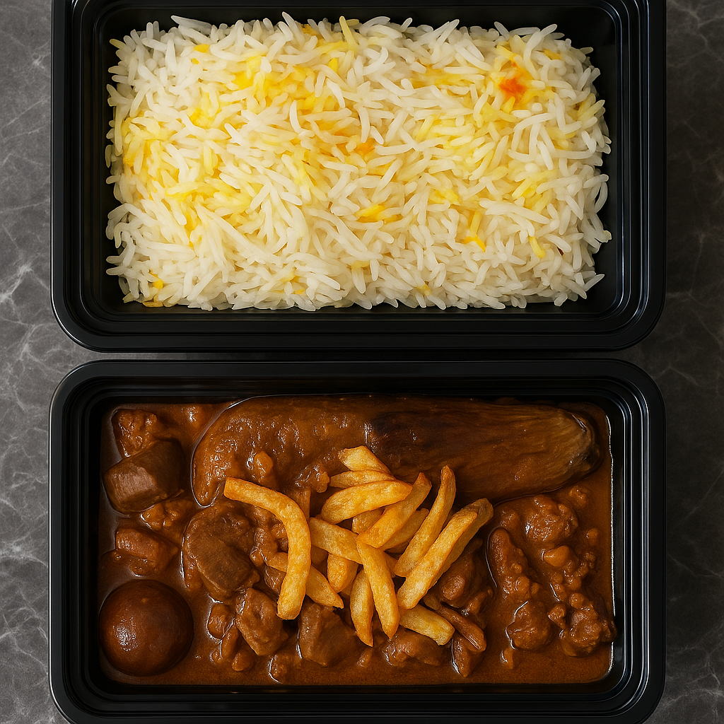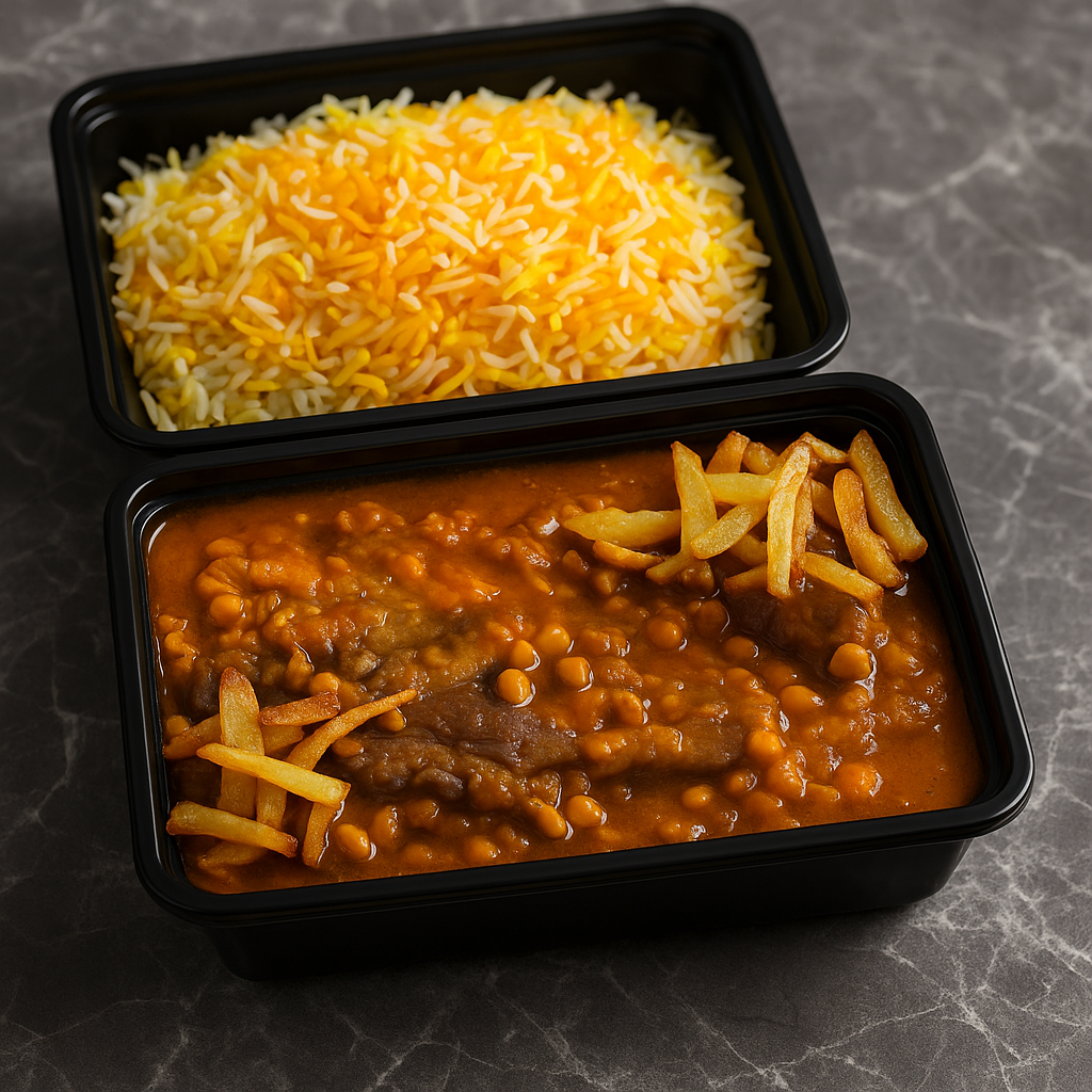 A fragrant and comforting Persian rice dish made with tender lamb shoulder, slow-cooked with green beans, tomatoes, and a blend of warm spices including cinnamon, turmeric, and saffron. The layers of fluffy rice and rich lamb stew are steamed together for a perfectly infused, flavour-packed meal.